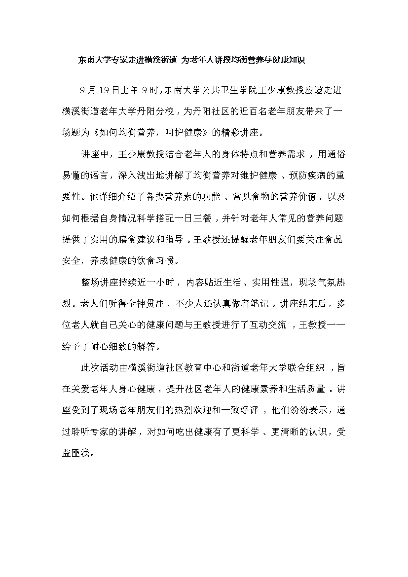 东南大学专家走进横溪街道 为老年人讲授均衡营养与健康知识